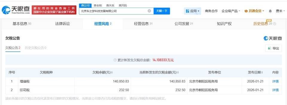 公众人物的商业版图总是伴随着放大镜式的审视。黄子韬持%的北京车之梦科技发展有限公司因欠万元税款被税务部门公示,这与他在综艺中挥金如土的富豪人设形成鲜明反差。尽管企业称已全额补缴并归咎于系统延迟,但舆论质疑声浪未平。